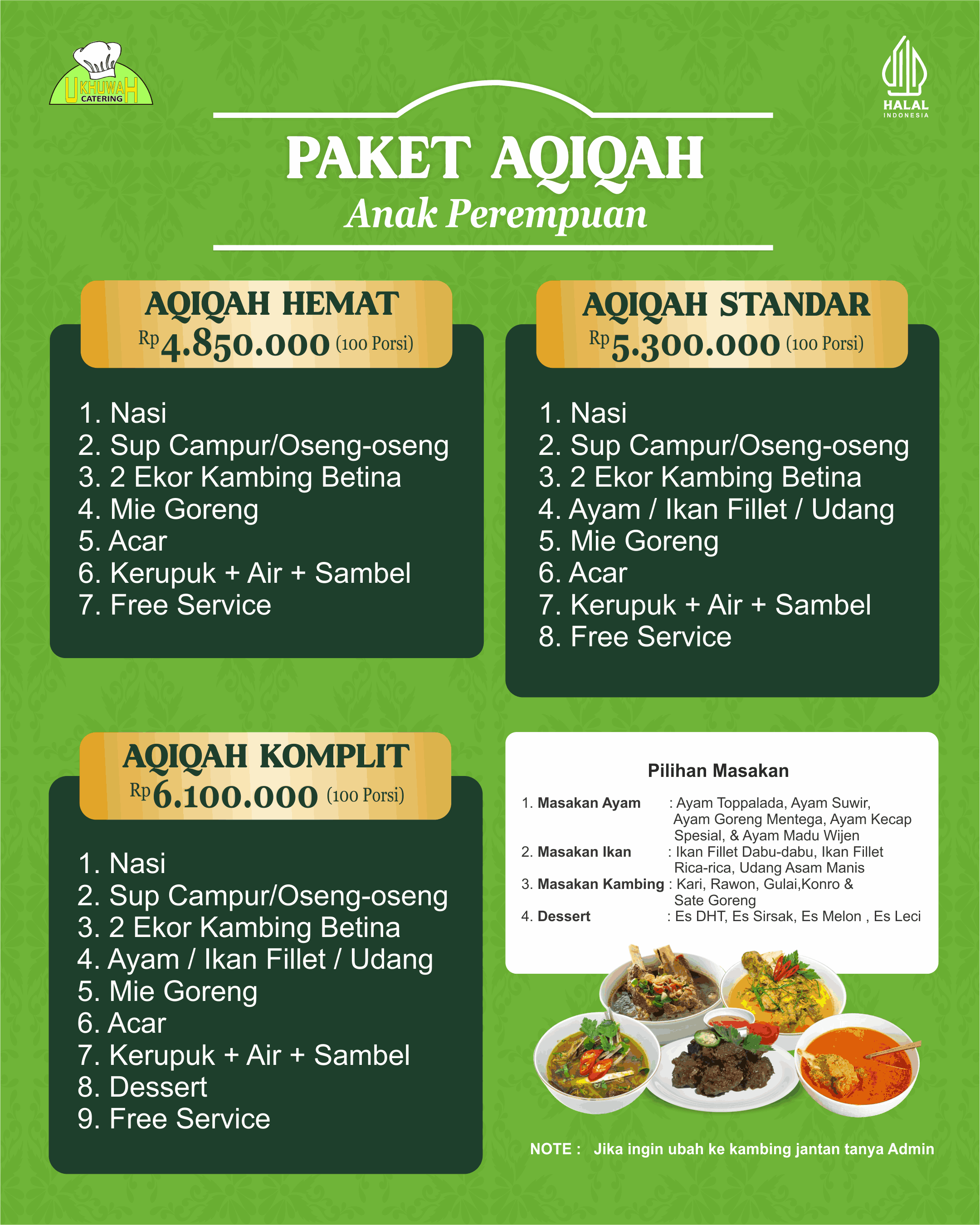 Paket aqiqah yang disediakan Catering Ukhuwah sudah termasuk kambing, sehingga bagi yang sudah memiliki kambing sendiri, dapat memesan paket prasmanan umum