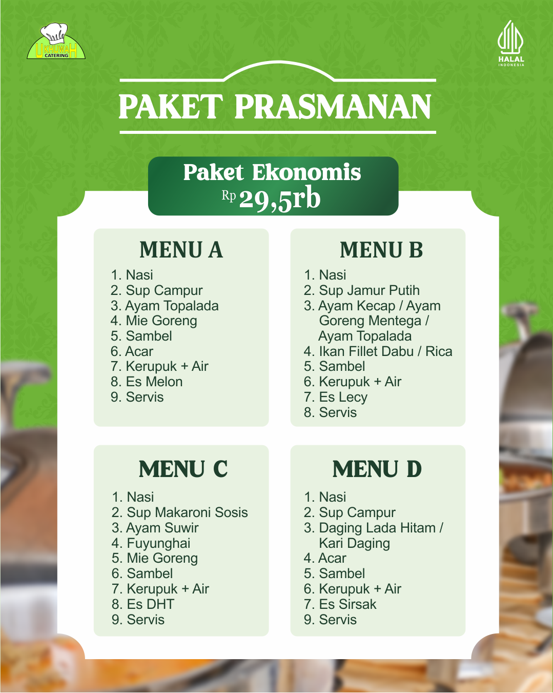 Untuk pemesanan paket dalam bentuk prasmanan minimal 100 porsi, dan untuk Nasi Kotak minimal 50 box, dengan syarat dan ketentuan yang berlaku di tiap paketnya