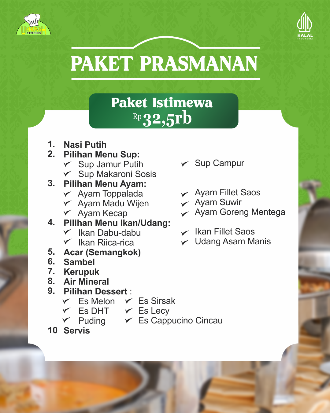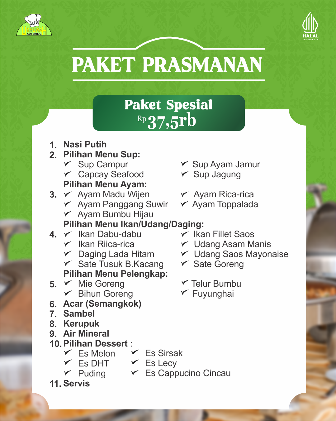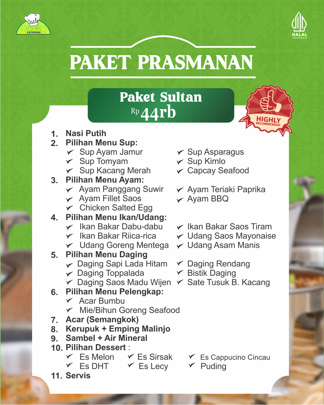 – Pemesanan paket prasmanan (Prasmanan umum) standar pemesanan 100 porsi, namun jika ingin memesan di bawah standar (50 porsi), diatur dalam ketentuan sebagai berikut: